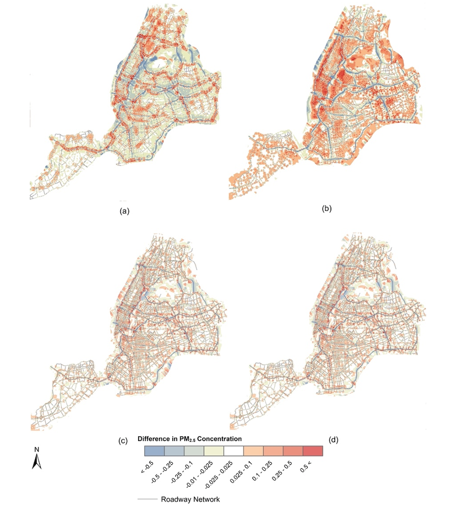 Spatial performance of ML models. Difference between average daily PM2.5 concentration from the target values: a) Single Hidden Layer Neural Network; b) CNN; c) ConvLSTM; d) ConvLSTM with Time-Series Data